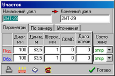 В поле “начальный узел” введите точное наименование начального объекта (потребитель, камера и т.д.) с которым связан участок. В поле “Конечный узел” точное наименование конечного объекта. Обратите внимание на то, что существует различие между заглавными и прописными буквами. После этого вам следует в соответствующие поля занести длины и диаметры подающей и обратной. Так же если Вам известна (реальная или предполагаемая) шероховатость и существующая на участке сумма коэффициентов местных сопротивлений, то вы можете внести эти данные в соответствующие поля. При необходимости в любой момент существует возможность перекрытия подающей и обратной. Для этого в “выпадающем” списке “Состояние” следует выбрать пункт “закр”. Переход в открытое состояние осуществляется точно также, только выбрать следует пункт “откр”.