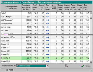 Если вы выберете первый, то появится еще одна панель, состоящая из списка – Зависимая система отопления, ГВС параллельного включения и т.д. Выбор любой из систем позволит, вывести на экран таблицу всех потребителей этого вида. В ней отображается вся информация по ним (Напр.: Наименование, Код, Нагрузка, Диаметр Шайб и др.). Прямо в этой таблице имеется возможность редактировать все данные. Для этого сделайте двойной щелчок мышью по нужной вам ячейке в таблице, а затем введите числовое значение. Панель закрывается нажатием на “крестик” в верхнем правом углу.