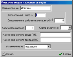 Что бы данный элемент моделировал работу подкачивающей насосной станции нужно занести следующие данные: