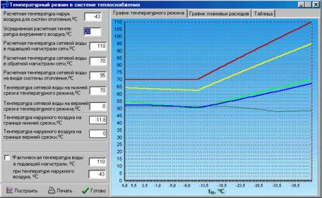 а странице “ График температурного режима ” вводятся параметры графика температурного режима отпуска теплоты на отопительный период для вашей тепловой сети. После то как вы ввели все необходимые данные необходимо для отображения графика нажать на кнопку “Построить”.