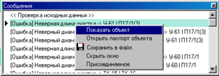 Существует несколько функций при работе с окном сообщений. Сделайте это окно активным. Внутри окна щелкните правой клавишей мышки. Появится всплывающее меню, состоящее из пунктов: “Показать объект”, ”Открыть окно паспорта”, ”Сохранить в файл”, ”Скрыть окно”, ”Присоединяемое”.
