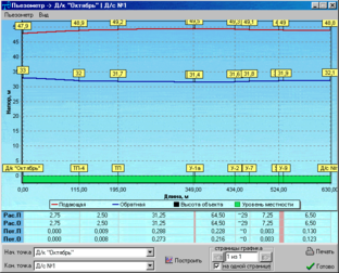 В программном комплексе “ТеплоЭксперт” существует возможность воспроизводить и накладывать пьезометрические графики в реальном рельефе местности по любой цепочке участков тепловой сети в разных режимах эксплуатации. В таблице, расположенной под пьезографиком, присутствуют сведения о расходах и гидравлических потерях на соответствующих участках тепловой схемы.