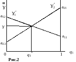 Обозначим 1- среднеожидаемый выигрыш, полученный стороной А при использовании его произвольно взятой смешанной стратегией SA=(p1, p2) против чистой стратегии В1 стороны В. Известно, что