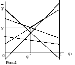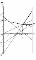 (показан жирной линией) имеет координаты q*10.67; 1.3, и через нее проходят прямые 2, 4, 5. Следовательно, сторона А имеет, вообще говоря, три активные стратегии А2, А4, А5, из которых можно выбрать две, например, А2 и А5 или А4 и А5 . Выбор А2 и А4 исключен, т.к. точка (0.67;1.3) перестает быть экстремальной.Пусть выбираются стратегии А2 и А5. Тогда игра 22 приобретает вид: