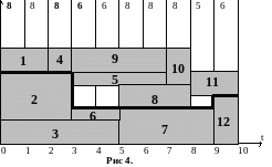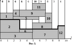 На рис 3. показан график потребности в ресурсах для сетевого графика представленного на рис 1. Ресурсы каждой работы изображаются прямоугольником, высота которого - число ресурсов необходимых для выполнения данной работы и ширина - длительность выполнения работы. Жирной линией показана потребность критических операций, которая должна быть обязательно удовлетворена. Над графиком указана суммарная потребность в ресурсах для каждого промежутка времени. Максимальная потребность составляет 10 единиц ресурсов. Нетрудно заметить, что при изменении времени работы №5, резерв времени которой составляет 2, с t=2 на t=3, и назначении начала работы №11 в наиболее поздний момент времени t=8 (см. Табл.2), максимальная потребность в ресурсах уменьшится и составит 8 единиц.