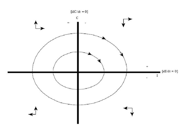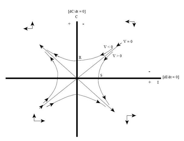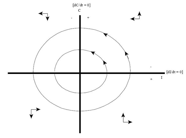 Соответствующий сектор содержит положительные переменные I и C, и траектории фазы снова дают