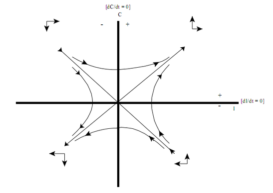 ). Присутствие возглавляемых США сил приводят к уменьшению в числе повстанческих нападений, а повстанческие нападения приводят к уменьшению в числе войск коалиции, так как боевая эффективность каждой стороны перевешивает усилия по пополнению с обеих сторон. Решение для равновесия системы: I=0, C=0, которые также оказывают непостоянное решение с теми же самыми собственными значениями, как показано в случае 1. Орбиты или траектории фазы даны тем же самым уравнением, как и в случае 1, и снова диаграмма фазы представляет седло. Однако стрелки, указывают на траектории фазы, в этом случае различны. Это показано на рисунке 2.