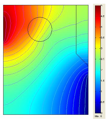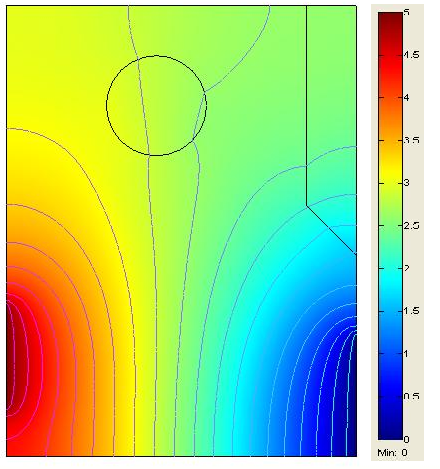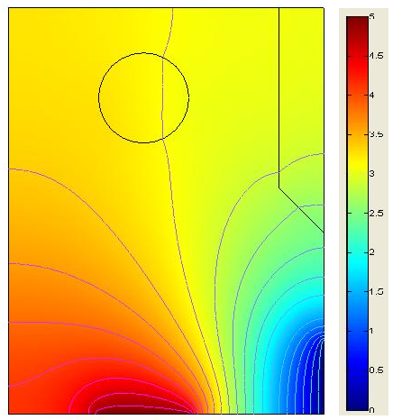Распределение плотности тока в объекте контроля можно найти, решив краевую задачу Лапласа относительно скалярного или векторного электрического потенциала с соответствующими граничными условиями. При решении задачи со скалярным потенциалом (для получения картины эквипотенциалей) граничные условия задаются значениями потенциалов (как правило, равными по величине и противоположными по знаку) в точках ввода токаю вслучае же задачи с векторным потенциалом (для получения картины линий тока) задаются разностью потенциалов на противоположных границах проводящей среды по отношению к точкам ввода тока для обеспечения заданной величины тока.