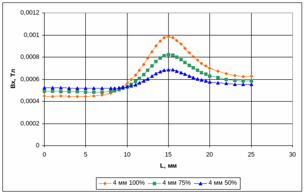 4) при увеличении глубины трещины наблюдается увеличение максимального значения магнитной индукции;