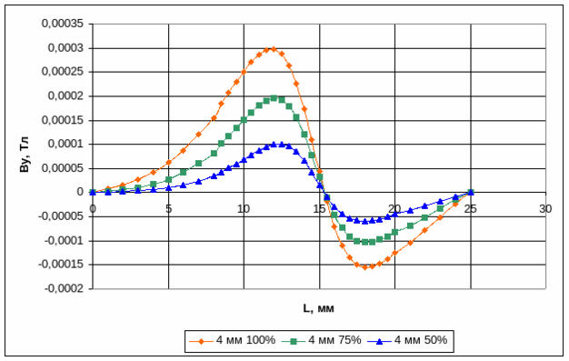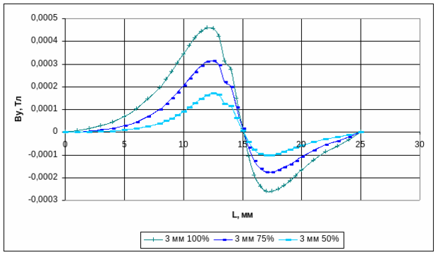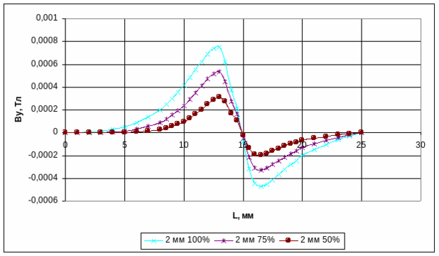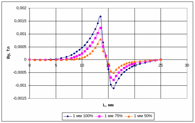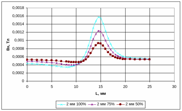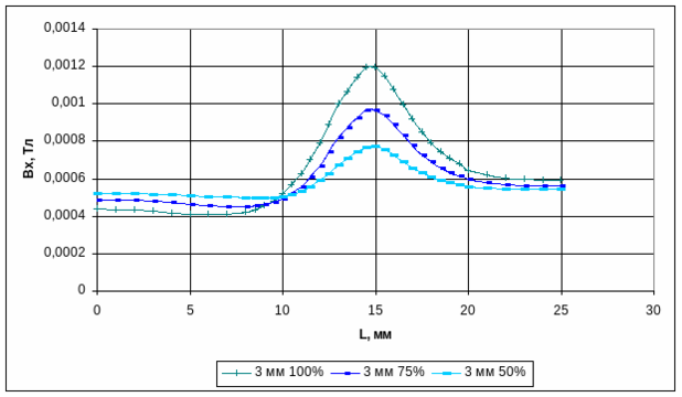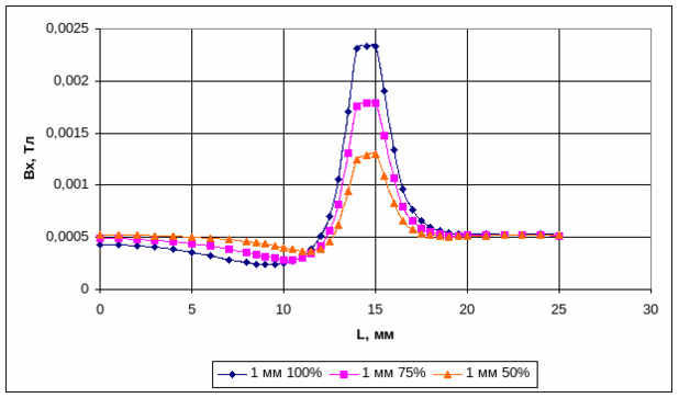1. При исследовании зависимостей сигнала датчика Холла от расстояния вдоль объекта контроля при изменении параметров самого объекта контроля можно сделать следующие наблюдения: