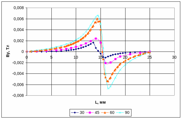 1.Для трещины, направленной под различным углом к поверхности снять показания датчика Холла при сканировании им области над дефектом(получить графики касательной и нормальной составляющих магнитной индукции вдоль линии, расположенной на расстоянии 1мм над поверхностью).