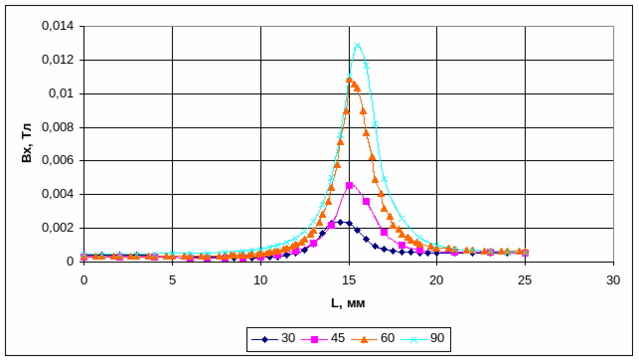 2) при уменьшении угла наклона трещины к поверхности ОК происходит смещение максимального значения магнитной индукции вдоль направления перемещения датчика;