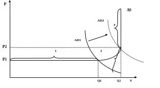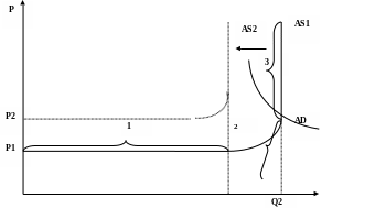 Такая инфляция возможна, если экономика находится на промежуточном (II) или классическом (III) отрезках.