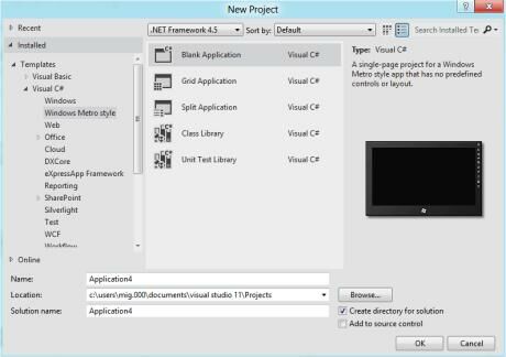 Now that you have a basic understanding (I hope) of the makings of a Metro application, let’s jump in and create a simple one. Keep in mind; in this article I’m going to keep things very simple. I’ll create a simple application first, and then introduce some navigation and view details for displaying information. I’ll cover live tiles and other advanced features in a future article. My goal here is to make you comfortable with creating Metro applications and knowing you can leverage your existing XAML and C# (and even Visual Basic) skills, and almost ignore the fact that you’re going to be calling into a new runtime.