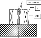 Ось малогабаритного соленоида С, через который проходит импульсный ток, осуществляющий намагничивание, перпендикулярна к поверхности ОК. Измерение осуществляется с помощью феррозонда-градиентометра, ось которого совпадает с осью соленоида С, а полузонды расположены вдоль этой оси симметрично относительно намагничивающего соленоида.