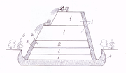 Полигон снизу и с боков прикрыт системой гидроизоляции, грунт покрыт слоем водонепроницаемой пленки толщиной 0,5 метра. Далее песок с дренажным приямком, потом глина, затем опять песок. Трубки предназначаются для отвода дождевой воды. Далее слой ТБО, который уплотняются с помощью бульдозера, а сверху слой материала, не пропускающего газ (2 и 4), затем снова слой ТБО и т.д. Откосы гидроизоляции сооружаются с помощью битума и соломы. Через год начинается выделение биогаза, срок эксплуатации 20-30 лет. Биогаз состоит на 60% из метана и 40% СО2.