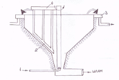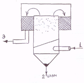 Газ поступает под решетку 1, проходит через отверстие решетки, барботирует через слой воды и пены, очищается от пыли за счет осаждения части пузырей. Режим работы аппарата, зависит от скорости подачи воздуха до 1 м/с – барботажный режим, 1,5 – пенный, 2 – 2,5 – барботажно-пенный. Появляется пенный слой, увеличивается эффективность очистки, но и увеличивается гидравлическое сопротивление.