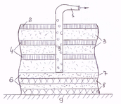 Очищаемый газ пропускается через слой фильтра в виде насадки, которая орошается водой, необходимая для жизнедеятельности микроорганизмов.