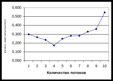 for(i=0; i for(i=0; i { hThreads[i] = CreateThread(NULL, 0, fPartCount, (void *)i, 0, &dwThreadsIDs[i]); if(hThreads[i] == NULL) printf("Error while creating thread"); } WaitForMultipleObjects(THREADS, hThreads, TRUE, INFINITE); for(i=0; i fPart = 0; //частичная сумма for(i=0; i for(i=0; i for(i=0; i { //создаем потоки hThreads[i] = CreateThread(NULL, 0, nPartCount, (void *)i, 0, &dwThreadsIDs[i]); if(hThreads[i] == NULL) printf("Error while creating thread"); } WaitForMultipleObjects(THREADS, hThreads, TRUE, INFINITE); //ждем завершения for(i=0; i nPart = 0; //частичная сумма for(i=0; i res = (f(a) + fPart * 4 + nPart * 2 + f(b)) * h / 6.0; //считаем весь интеграл } int _tmain(int argc, _TCHAR* argv[]) { int steps = 0; double time; clock_t start, finish; start = clock(); //время начала intervals = THREADS; h = (b-a)/(double)(intervals); Solve(res1); do { if(steps != 0) res1 = res2; steps++; intervals = intervals * 2; h = h / 2.0; Solve(res2); printf("Integral = %.15f\n", res2); } while (fabs(res1 - res2)/15.0 > eps); finish = clock(); //время окончания подсчета time = (double)(finish - start) / CLOCKS_PER_SEC; FILE * f = fopen(".\\Result.txt", "w"); printf( "\nResult = %.15f\nSteps = %d\nThreads number = %d \nTime = %f\n", res2, steps, THREADS, time); fprintf(f, "\nResult = %.15f\nSteps = %d\nThreads number = %d \nTime = %f\n", res2, steps, THREADS, time); fclose(f); getch(); return 0; } Тестирование Процессор: AMD Athlon XP Barton 2500+ 1.83 Ghz Памать: 2x1024 DDR3200 ОС: Windows XP SP3 rc1 Зависимость времени вычисления интеграла от количества процессов 0,297 0,266 0,235 0,172 0,250 0,281 0,282 0,329 0,359 0,547 1 2 3 4 5 6 7 8 9 10 Вывод Как видно из графика, с увеличением числа потоков от 1 до 4, время вычисления интеграла уменьшается. Если продолжить вычисления увеличивая число потоков, то время вычисления начинает сильно повышаться, и при количестве потоков больше 7, использование WinThreads не приносит увеличения производительности. Наибольшая производительность (40%) получена на 4 потоках. Результаты тестирования могу существенно отличаться на машине с другим процессором (например двуядерным). 4