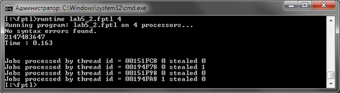 Вывод: применение языка FPTL для распараллеливания решения предложенной задачи описанным методом не даёт какого-либо ускорения.
