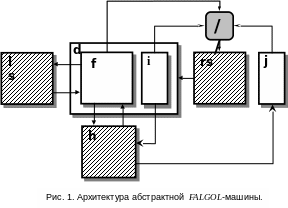 3.2. Абстрактная FALGOL-машина. На рис. 1 представлена архитектура абстрактной FALGOL-машины. Ее основными компонентами, состояние которых передается от одного рабочего цикла к другому, являются