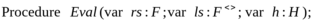 Алгоритм работы FALGOL-машины описан в форме рекурсивной процедуры на Pascal-подобном языке. Результатами работы FALGOL-машины являются заключительные состояния левого стека (собственно результаты вычислений) и кучи (побочный эффект); выполнение программы завершается безрезультатно, если в процессе работы FALGOL-машины предпринимается попытка чтения данного из пустого левого стека. Возможен и такой случай, когда выполнение программы длится бесконечно долго; результат при этом также не определен. Условие корректности, во-первых, гарантирует, что в процессе работы FALGOL-машины не возникнет обращение для чтения или записи к находящейся в некотором состоянии