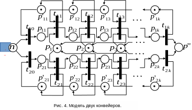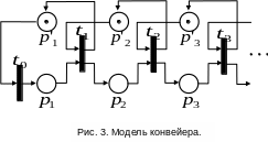 На рис. 3 показана сеть Петри, моделирующая продвижение деталей на конвейере. Каждое рабочее место представлено двумя позициями:
