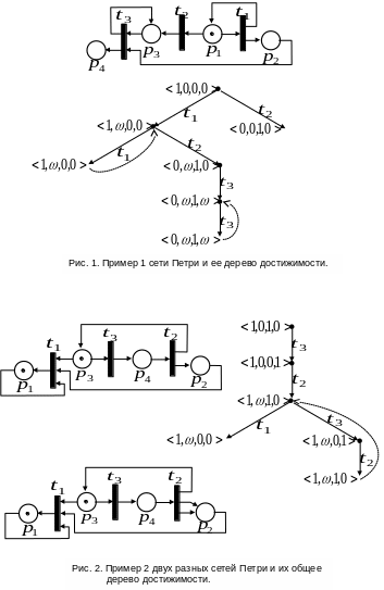 Дерево достижимости в общем случае не определяет однозначно множество достижимых маркировок. На рис. 2 показаны две разные сети Петри, имеющие одно и то же дерево достижимости, хотя для первой из них существуют достижимые маркировки с любым количеством фишек в позиции