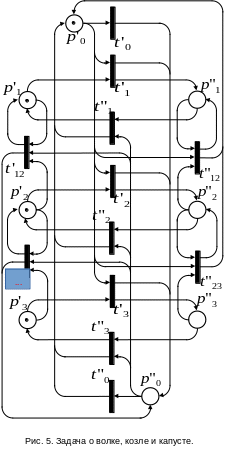 На рис. 5 изображена сеть Петри, моделирующая систему, известную как «задача о волке, козле и капусте», которую должен решить лодочник: как перевезти на другой берег реки всех троих, если в лодку с собой лодочник может брать не более одного «пассажира», а, с другой стороны, нельзя оставлять без присмотра волка вместе с козлом и козла вместе с капустой?