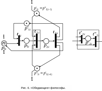 а рисунке 6 выделен фрагмент модели (для одного места за столом) поведения системы, в которой сидящий в кресле философ для того, чтобы начать есть, ожидает, когда обе палочки – справа и слева – одновременно окажутся свободны. В этой сети все переходы при любой достижимой маркировке потенциально живые, так что никто из философов не умрет с голода. Если выделенный фрагмент, моделирующий ожидание, заменить на другой фрагмент, показанный на рисунке справа (если философ видит слева свободную палочку, он берет ее и ждет, когда освободится палочка справа), то в полученной сети может быть достигнута тупиковая маркировка, которая означает голодную смерть для всех философов. Существуют и другие способы организации поведения рассматриваемой системы с благоприятным для всех философов исходом.