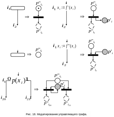 построение переходов сети иллюстрирует рис. 18. На нем показана трансляция начального и заключительного блока, блоков присваивания и блоков ветвления программы.