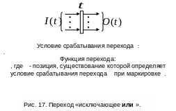 ети Петри с переходами «исключающее или ». Наряду с обычными переходами, готовность к срабатываниям для которых по отношению к входным дугам реализует дисциплину «и », в сети могут использоваться переходы, реализующие дисциплину «исключающее или »: переход может сработать, если только в одной из входных позиций есть фишки, а в остальных - фишек нет. Если для некоторой позиции