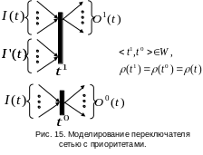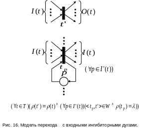 Для сетей с приоритетами свойство семантической монотонности в общем случае также не имеет места, так как сети с переключателями и сети с ингибиторными дугами довольно просто моделируются сетями с приоритетами. На рис. 15 и 16 показано, как осуществляется такое моделирование.