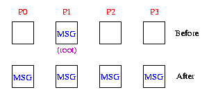 for(i=0; i {  MPI_Send(…); }  for(i=0; i {  MPI_Recv(…);  }  Если запустить эти процессы, мы получим тупик, так как процессы зайдут в функцию MPI_Send() и будут ждать ее завершения. А для ее завершения необходимо выполнение функции MPI_Recv, которая никогда не выполнится.  Чтобы избежать взаимной блокировки можно выполнить взаимный обмен данными между процессами, используя совмещенную операцию MPI_Sendrecv.  int MPI_Sendrecv(void *sbuf, int scount, MPI_Datatype stype, int dest, int stag, void *rbuf, int count, MPI_Datatype rtype, int source, int rtag, MPI_Comm comm, MPI_Status *status), где  sbuf, scount, stype, dest, stag — параметры передаваемого сообщения;  rbuf, rcount, rtype, source, rtag — параметры принимаемого сообщения;  comm — коммуникатор, в рамках которого выполняется передача данных;  status — структура данных с информацией о результате выполнения операции.  Тогда каждый процесс будет содержать следующий код:  for(i=0; i {  MPI_Sendrecv(…);  }  ------------------------------------------------------------------------  4. Пример использования MPI_Waitall, MPI_Waitany  Процедура MPI_Waitall:  int MPI_Waitall(int count, MPI_Request *requests, MPI_Status *statuses), где  – count - число идентификаторов;  – requests - массив идентификаторов асинхронного приема или передачи;  – OUT statuses - параметры сообщений.  Выполнение процесса блокируется до тех пор, пока все операции обмена, ассоциированные с указанными идентификаторами, не будут завершены. Если во время одной или нескольких операций обмена возникли ошибки, то поле ошибки в элементах массива statuses будет установлено в соответствующее значение.  Пример. Сеть из 4 узлов с круговой топологией. Каждый узел посылает двум соседям сообщения и ждет ответа от них. Работа каждого узла не завершится до тех пор, пока все 4 операции не будут выполнены.  # include   # include   int main(int argc, char** argv) {  int numtasks, rank, next, prev, buf[2], tag1 = 1, tag2 = 2;  MPI_Request reqs[4];  MPI_Status stats[4];   MPI_Init(&argc,&argv);  MPI_Comm_size(MPI_COMM_WORLD, &numtasks);  MPI_Comm_rank(MPI_COMM_WORLD, &rank);   prev = rank - 1;  next = rank + 1;  if (rank == 0) prev = numtasks - 1;  if (rank == (numtasks - 1)) next = 0;   MPI_Irecv(&buf[0], 1, MPI_INT, prev, tag1, MPI_COMM_WORLD, &reqs[0]);  MPI_Irecv(&buf[1], 1, MPI_INT, next, tag2, MPI_COMM_WORLD, &reqs[1]);  MPI_Isend(&rank, 1, MPI_INT, prev, tag2, MPI_COMM_WORLD, &reqs[2]);  MPI_Isend(&rank, 1, MPI_INT, next, tag1, MPI_COMM_WORLD, &reqs[3]);  MPI_Waitall(4, reqs, stats);  printf("Node %d: all ok!\n", rank);  MPI_Finalize();  }  Результат выполнения программы на 4 процессах: Node 1: all ok! Node 3: all ok!  Node 2: all ok!  Node 0: all ok!  Процедура MPI_Waitany:  int MPI_Waitany(int count, MPI_Request *requests, int *index, MPI_Status *status), где  – count - число идентификаторов;  – requests - массив идентификаторов асинхронного приема или передачи;  – OUT index - номер завершенной операции обмена;  – OUT status - параметры сообщений.  Выполнение процесса блокируется до тех пор, пока какая-либо операция обмена, ассоциированная с указанными идентификаторами, не будет завершена. Если несколько операций могут быть завершены, то случайным образом выбирается одна из них. Параметр index содержит номер элемента в массиве requests, содержащего идентификатор завершенной операции.  Пример. Изменим предыдущий пример используя функцию MPI_Waitany вместо MPI_Waitall.  # include   # include   int main(int argc, char** argv) {  int numtasks, rank, next, prev, buf[2], tag1 = 1, tag2 = 2;  int *i;  MPI_Request reqs[4];  MPI_Status stats[4];   MPI_Init(&argc,&argv);  MPI_Comm_size(MPI_COMM_WORLD, &numtasks);  MPI_Comm_rank(MPI_COMM_WORLD, &rank);   prev = rank - 1;  next = rank + 1;  if (rank == 0) prev = numtasks - 1;  if (rank == (numtasks - 1)) next = 0;   MPI_Irecv(&buf[0], 1, MPI_INT, prev, tag1, MPI_COMM_WORLD, &reqs[0]);  MPI_Irecv(&buf[1], 1, MPI_INT, next, tag2, MPI_COMM_WORLD, &reqs[1]);  MPI_Isend(&rank, 1, MPI_INT, prev, tag2, MPI_COMM_WORLD, &reqs[2]);  MPI_Isend(&rank, 1, MPI_INT, next, tag1, MPI_COMM_WORLD, &reqs[3]);  MPI_Waitany(4, reqs, &i, stats);  printf("Node %d: all ok!\n", rank);  MPI_Finalize();  }  Результат выполнения программы на 4 процессах: Node 1: all ok! Node 3: all ok! Node 2: all ok! Node 0: all ok!  --------------------------------------------------  5. Пример использования MPI_Bcast  Broadcast - п