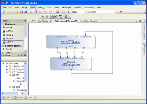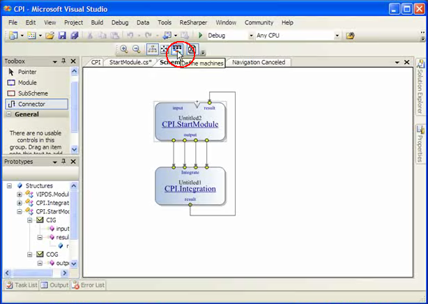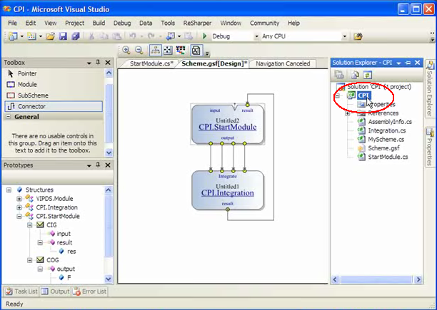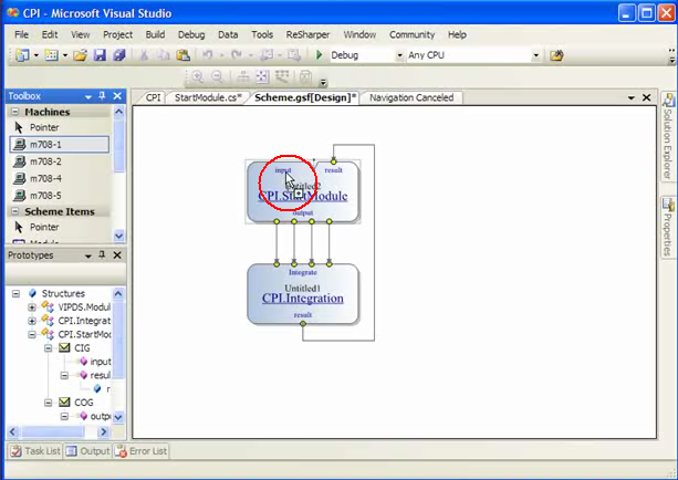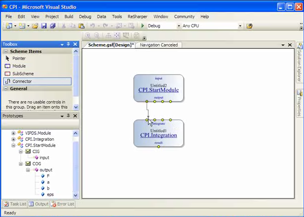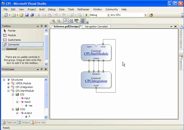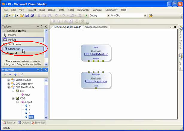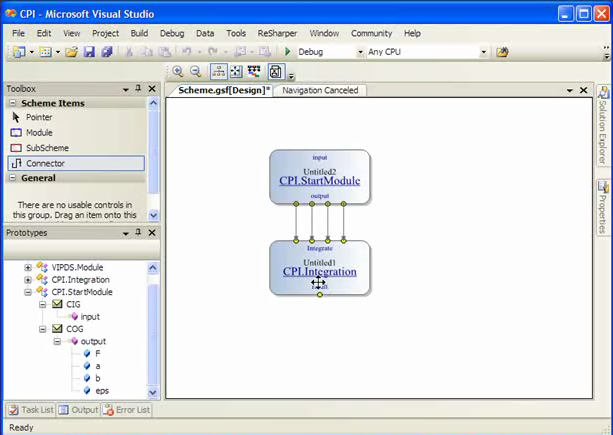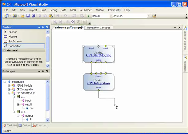 11. На граф-схеме выделить выход группы выходов output модуля CPI.StartModule и, не отпуская левой кновки мыши, провести связь до входа группы входов Integrate модуля CPI.Integration.