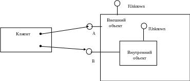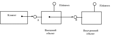 • Внешний объект передает внутреннему объекту указатель на интерфейс IUnknown