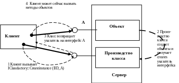 • Клиент вызывает CoGetClassObject, чтобы получить указатель на производящий класс