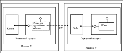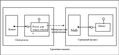 • Объект на удаленном сервере также полагается на proxy и stub, но использует вызов удаленной процедуры (RPC) для коммуникации