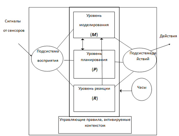 Каждый из этих уровней имеет модель мира агента на соответствующем уровне абстракции и содержит возможности, соответствующие уровню. Каждый из уровней напрямую связан с компонентой восприятия и действия и в состоянии независимо от других уровней решать, реагировать или не реагировать в текущем состоянии мира. В архитектуру включена Подсистема управления на основе правил, активируемая контекстом с задачей обеспечить подходящее поведение агента в случае конфликта вариантов поведения, инициируемого различными уровнями. Система реализована как комбинация технологии обмена сообщениями и контекстной активации управляющих правил (в соответствии со спецификой предметной области), выступающей в роли посредника, который исследует данные разных уровней (воспринимаемый вход и выходы разных уровней), вводит на различные уровни новые данные и удаляет некоторые данные.