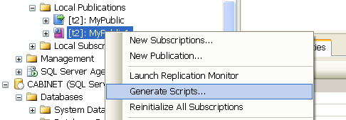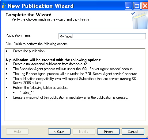 exec sp_addpublication @publication = N'MyPublic1', @description = N'Snapshot publication of database ''t2'' from Publisher ''SONYP''.', @sync_method = N'native', @retention = 0, @allow_push = N'true', @allow_pull = N'true', @allow_anonymous = N'true', @enabled_for_internet = N'false', @snapshot_in_defaultfolder = N'true', @compress_snapshot = N'false', @ftp_port = 21, @ftp_login = N'anonymous', @allow_subscription_copy = N'false', @add_to_active_directory = N'false', @repl_freq = N'snapshot', @status = N'active', @independent_agent = N'true', @immediate_sync = N'true', @allow_sync_tran = N'false', @autogen_sync_procs = N'false', @allow_queued_tran = N'false', @allow_dts = N'false', @replicate_ddl = 1