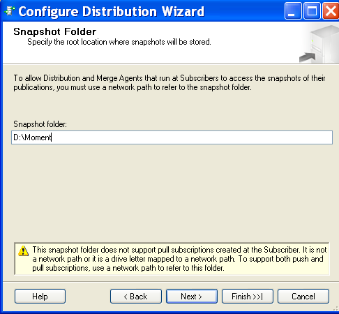 Затем указываем расположение моментального снимка, Моментальный снимок необходим для начальной инициализации репликации.