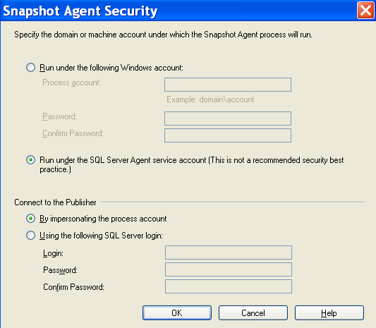 exec sp_addpublication_snapshot @publication = N'MyPublic1', @frequency_type = 1, @frequency_interval = 0, @frequency_relative_interval = 0, @frequency_recurrence_factor = 0, @frequency_subday = 0, @frequency_subday_interval = 0, @active_start_time_of_day = 0, @active_end_time_of_day = 235959, @active_start_date = 0, @active_end_date = 0, @job_login = null, @job_password = null, @publisher_security_mode = 1