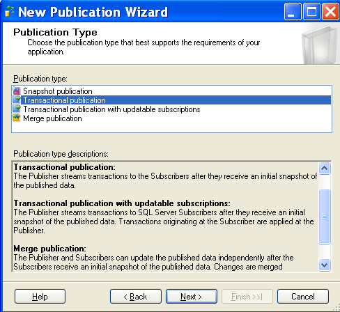 Репликация транзакций реализуется агентом моментальных снимков, агентом чтения журналов и агентом распространителя SQL Server. Агент моментальных снимков готовит файлы моментальных снимков, содержащие схему, данные публикуемых таблиц и объекты базы данных, хранит файлы в папке моментальных снимков и записывает задания синхронизации в базу данных распространителя на распространителе.