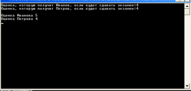 Console.WriteLine("Оценка, которую получит Иванов, если будет сдавать экзамен:" + Ivanov.ocenka);