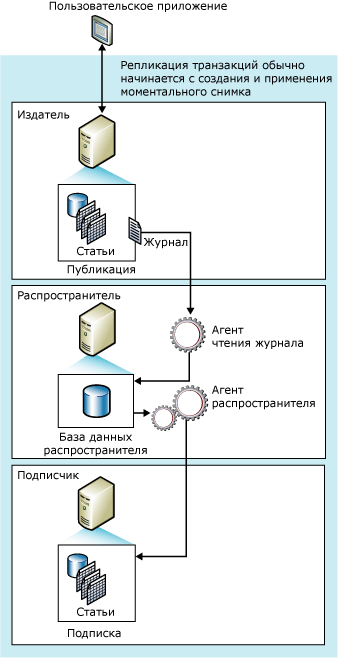 На следующем рисунке показаны основные компоненты репликации транзакций.