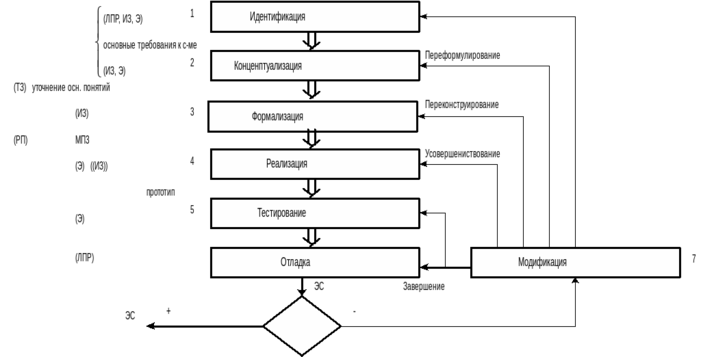 1 – постановка задачи, выработка основных требований; участвуют ЛПР, ИЗ, Э (сроки разработки, финансирования и т.п)