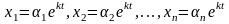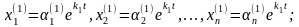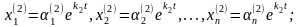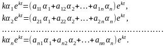 Требуется определить постоянные 1,2,,…,n и k так, чтобы функции 1ekt, 2ekt,…,nekt удовлетворяли системе уравнений (1). Подставляя их в систему (1), получим: