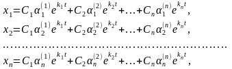 Обозначим через k1, k2,,…,kn корни характеристического уравнения. Для каждого корня ki напишем систему (3) и определим коэффициенты