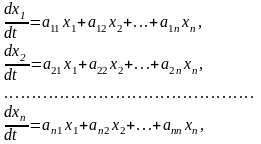 где коэффициенты aij суть постоянные. Здесь t – аргумент, x1(t), x2(t),…xn(t) – искомые функции. Система (1) называется системой линейных однородных дифференциальных уравнений с постоянными коэффициентами.