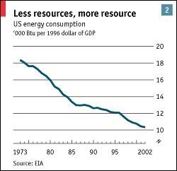 Несколько сил объясняют разъединение использования энергии и экономической продукции в богатом мире. Каждый - широкий переход от производства до обслуживания и информационных отраслей промышленности, которые типично требуют меньшего количества входа энергии. Другой - объятие политик, определенно намеревался поощрять эффективность энергии. В Европе и Японии, правительства приняли более высокие налоги энергии на том основании, что экологическое и безопасность "внешности", вовлеченные в использование нефти не были отражены в рыночной цене. В Америке, политические деятели решили использовать регулирование, а не цену, чтобы поощрить эффективность.